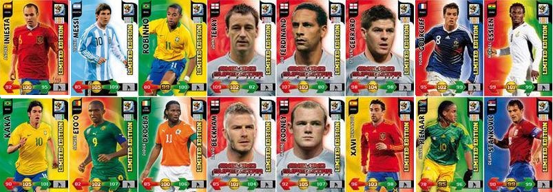 suche Limitierte Karten: Messi, Argentinien, Robinho Brasilien, Kaka, Brasilien, Beckham, England, Rooney, England, Xavi, Spanien, Eto `o Kamerun, Drogba, Elfenbeinküste, Gouruff, Frankreich, Essien, Ghana, Pienaar, Süd Afrika, Stankovic, Serbien, Schweinsteiger, Deutschland,Klose, Deutschland,